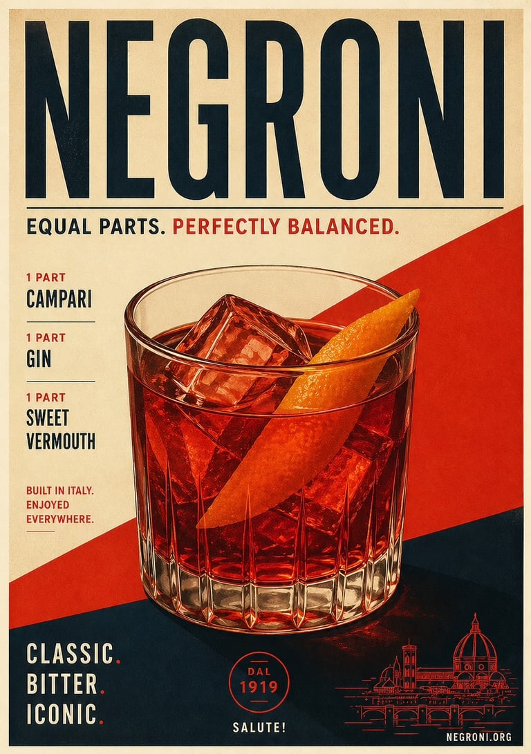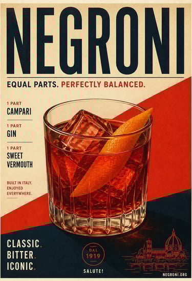 This Negroni poster for your venue or home is inspired by the 100+ years of Negroni cocktail history and Italian Dolce Vita spirit.